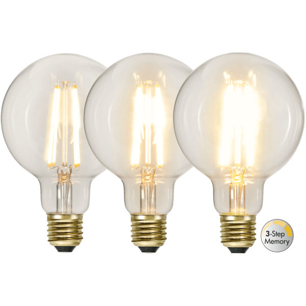 En av våra ljuskällor med 3-stegs dimmer. Globformad ljuskälla med 3-stegs klickdimring med minnesfunktion! Ljusstyrkan ändras enkelt genom slå av och på strömbrytaren. Välj mellan 70lm - 350lm - 700lm. Ljusfärgen är 2100K och sockeln är E27. Startar på senast använda ljusstyrkan.