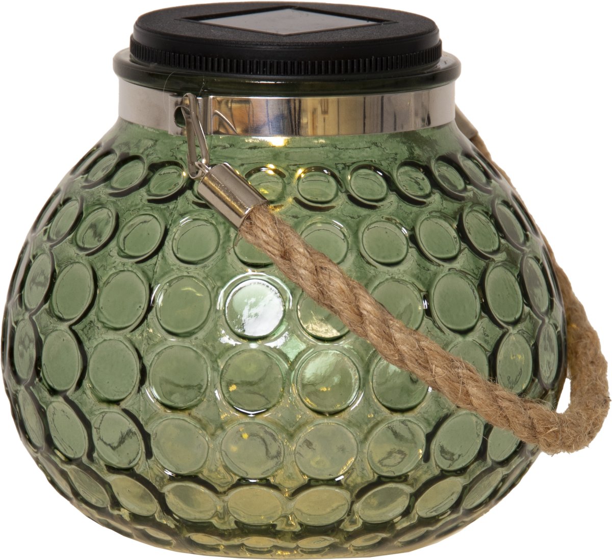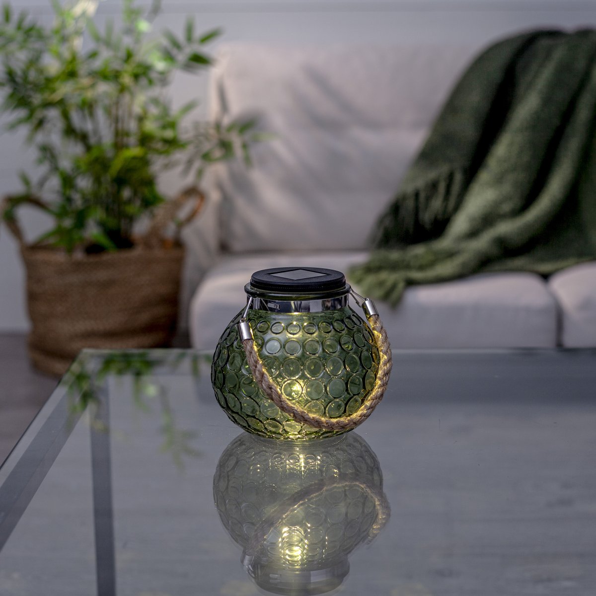 Denna solcellslykta blir en vacker prydnad till din uteplats eller balkong. Designad i ett vackert grönt glas sprider lyktan stämningsfullt ljus vart än du placerar den. Den bubbliga ytan är en charmig detalj som adderar det lilla extra, och handtaget i rep gör den enkel att flytta runt efter behov och känsla.