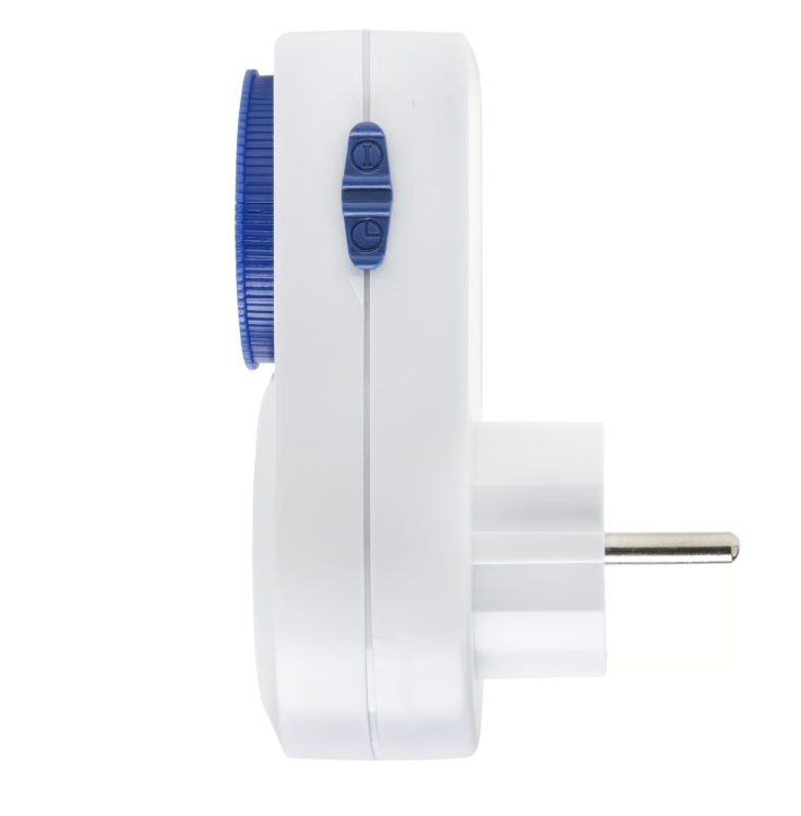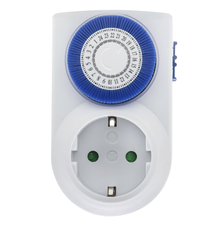 Jordad timer med mekanisk 24 h-skiva för inomhusbruk. Utrustad med reglage för att inaktivera timerfunktionen.
