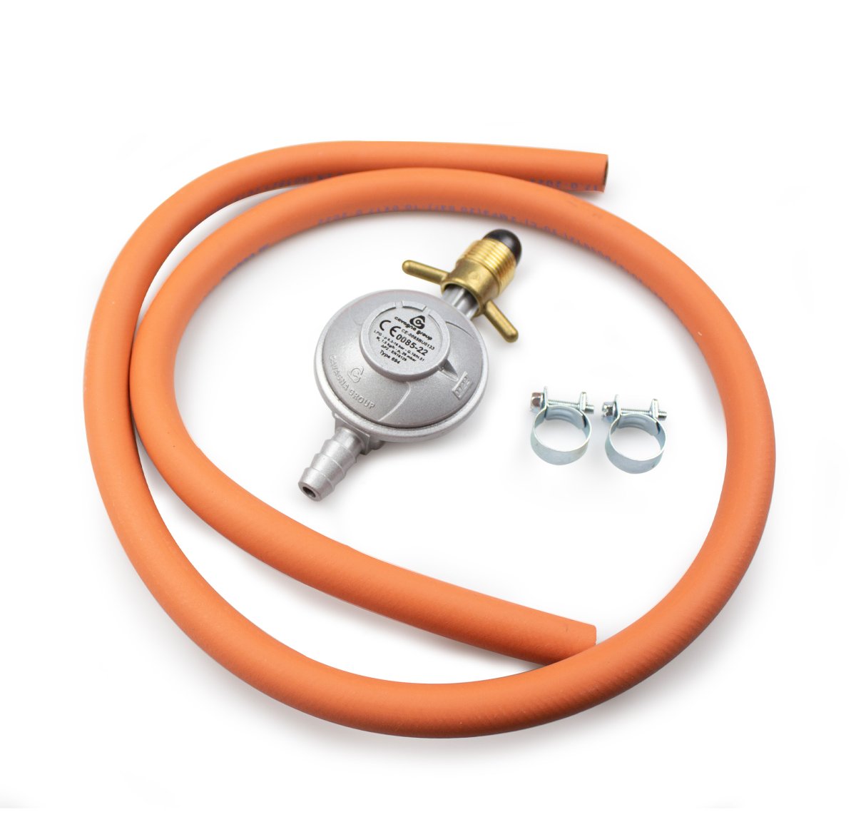 Regulatorset för svenska gasolflaskor. Regulator 29 mBar, 1,2 meter slang, Ø 10 mm, och 2 st slangklämmor. CE-godkänd enligt EN16129. Passar till alla Muurikkas stekhällsset och gasolbrännare.