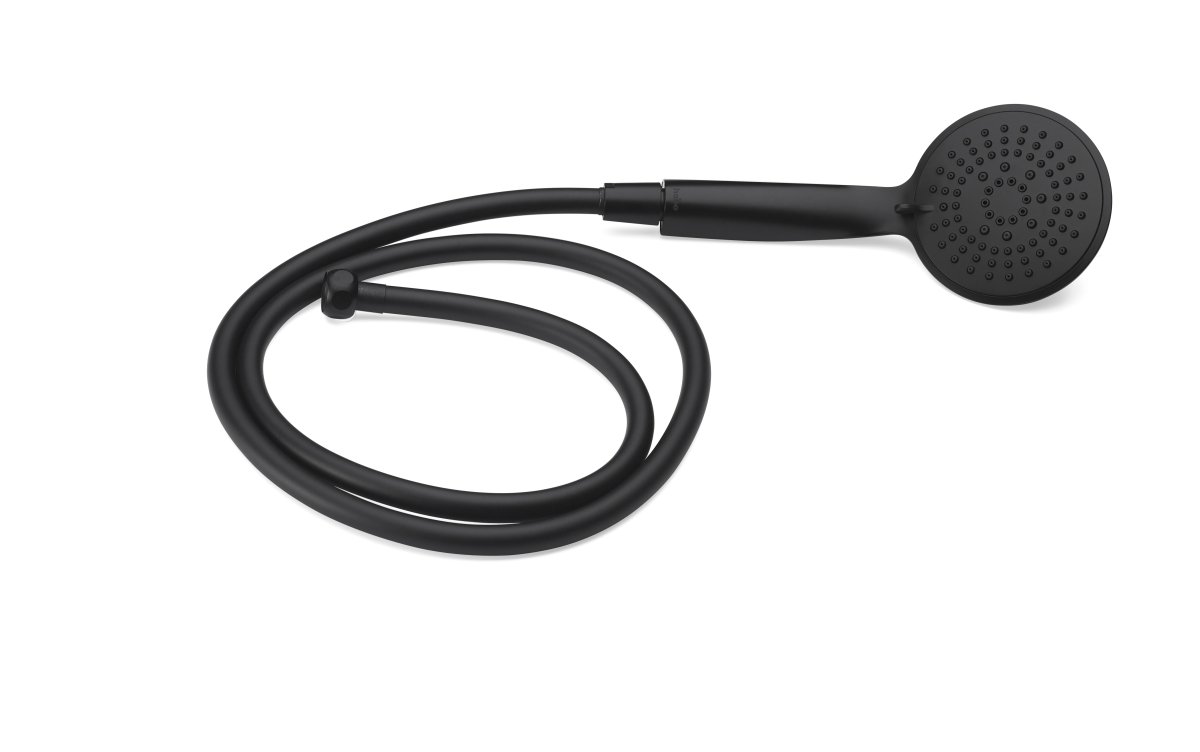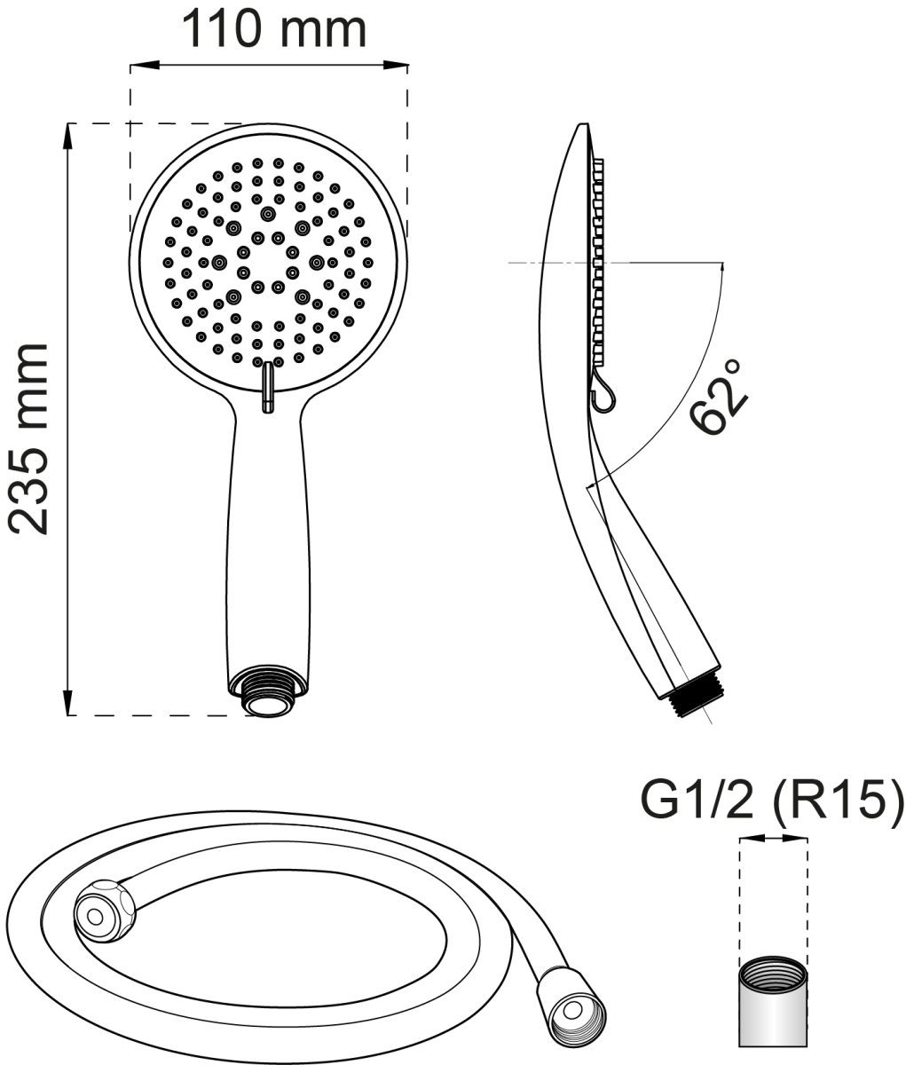 Duschpaket med en handdusch och 1,5 meter duschslang. Handdusch med tre stråltyper, diameter duschhuvud 110 mm. Med antikalkfunktion. Rubber Clean-gummi på munstycket gör att det är enkelt att avlägsna kalk. Passar alla blandare och duschslangar, G1/2.